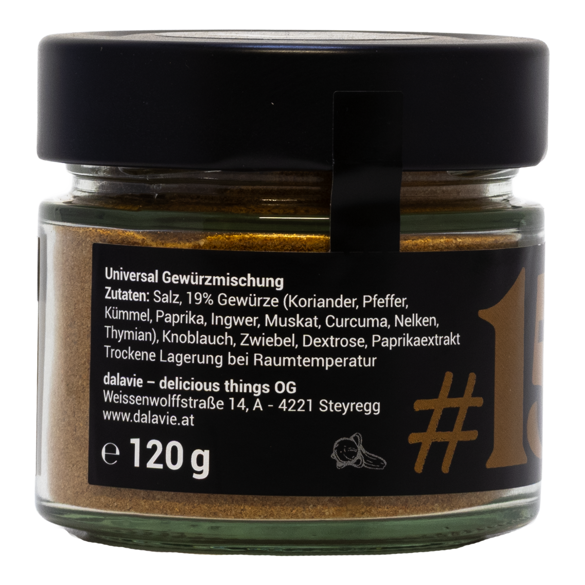 Die Mischung aus Salz, Gewürzen (Koriander, Pfeffer, Kümmel, Paprika, Ingwer, Muskat, Curcuma, Nelken), Kräutern (Thymian), Gemüse (Knoblauch, Zwiebel) sowie weiteren Zutaten (Dextrose, Paprikaextrakt) sorgt für eine runde, vielseitige Würze.