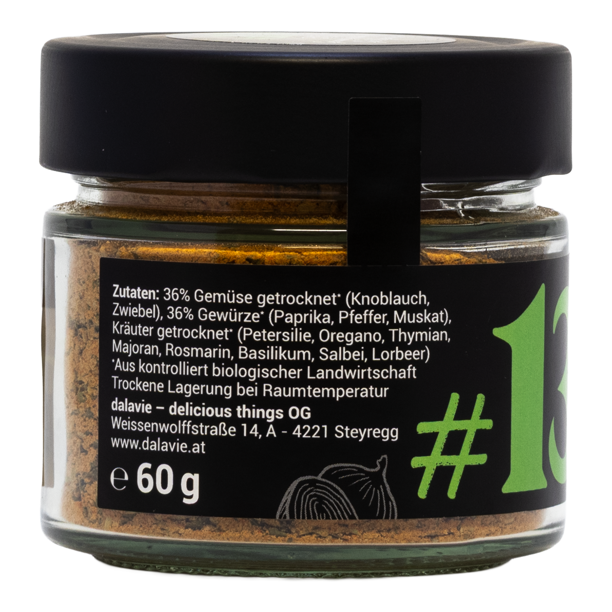 Die Mischung besteht aus Gemüse (getrockneter Knoblauch, Zwiebel), Gewürzen (Paprika, Pfeffer, Muskat) sowie Kräutern (Petersilie, Oregano, Thymian, Majoran, Rosmarin, Basilikum, Salbei, Lorbeer). Alle Zutaten stammen aus kontrolliert biologischer Landwirtschaft.